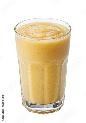 Refreshing peach smoothie in glass, pale yellow, with smooth, thick texture on a dark background