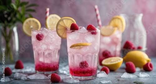 Refreshing raspberry lemonade cocktails with ice garnished with lemon slices and raspberries on a colorful background perfect for summer parties.