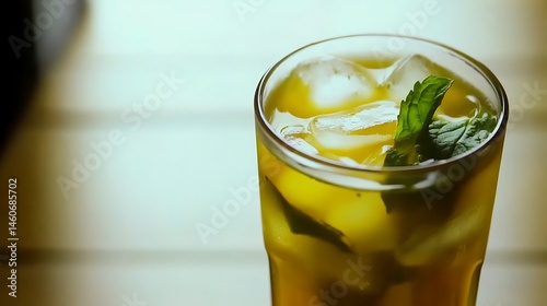 Refreshing yellow beverage with ice cubes and fresh mint garnish close-up