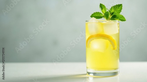 Refreshing Yellow Citrus Beverage with Ice and Mint Garnish in a Tall Glass