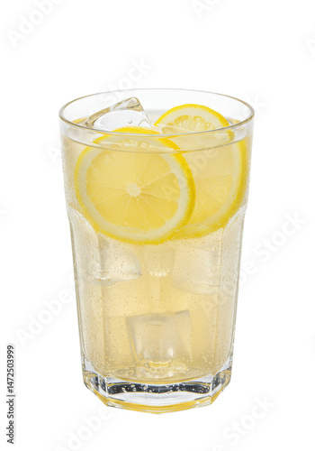 Refreshing yellow drink with lemon slices and ice cubes in clear glass, on dark backdrop
