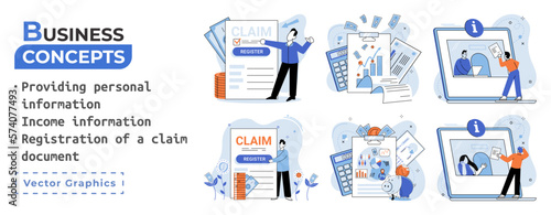 Registration of claim form register document, providing personal information, income information vector set. Employer form, earnings statement documents. Tax, financial and accounting reporting