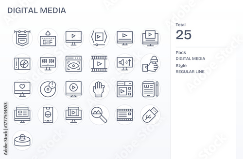 Regular Line Grid Fitted Vector Icons from Digital Media Set with 25 128x128 Icons