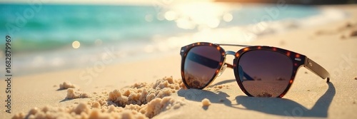 Relaxing beach scene with stylish sunglasses left on the sand, sun reflecting off the lenses Perfect for summer, travel, and vacation themes , UV, style