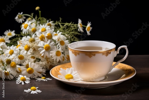 Relaxing chamomile tea in elegant porcelain cup with fresh chamomile flowers on dark wooden background