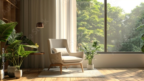 Relaxing corner with comfortable armchair, stylized with houseplants and a calming view of nature through a modern window.