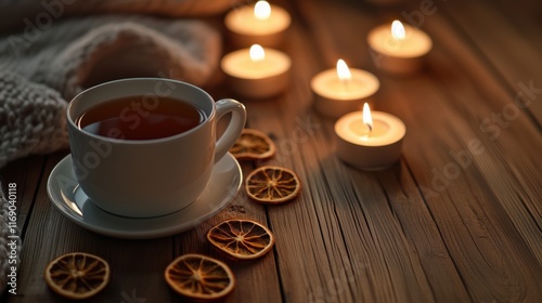 Relaxing evening with a warm cup of tea and candles on a wooden table