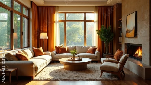 Relaxing Living Room with Warm Hues and Abundant Natural Light Streaming Through Large Windows