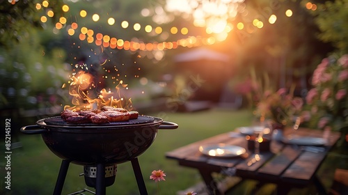 relaxing summer evening in a backyard garden with a grill BBQ, wooden table decorated with flowers, blurred background