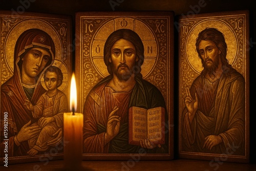 Religious icons of Jesus Christ, Virgin Mary, and a candle in a warm, inviting light