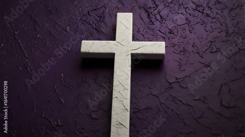 Religious White Marble Cross Hanging on Purple Textured Stucco Wall