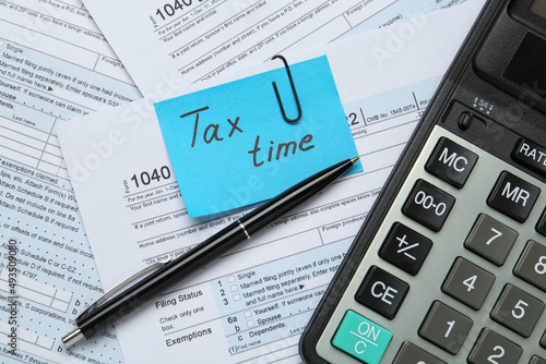 Reminder note with words TAX TIME, pen and calculator on documents, flat lay