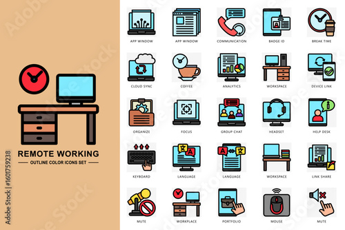 Remote working outline color icons set. contain app window, communication, badge id, workplace, keyboard, headset, mute and more. Vector for modern concept, print, UI, UX kit, web and app development.