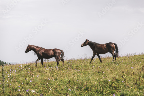Republic of Adygea / Russia - July 28, 2018: Horses graze in the fields of the Caucasian Reserve