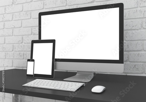 Responsive mockup screen. Monitor, tablet, phone on table in office. 3d rendering.