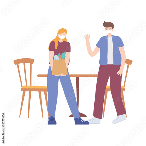 restaurant social distancing, couple with grocery bags and medical masks, covid 19 coronavirus