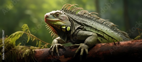 Resting next to garden plants is a green iguana with copy space image.