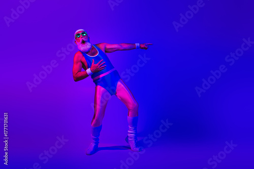 Retro fitness icon in blue jumpsuit strikes a dramatic pose under purple and blue neon lights for a dynamic sportswear shoot highlighting style and joy