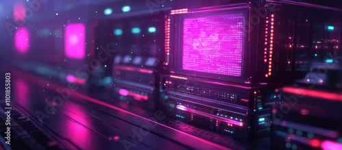 Retro futuristic server room with pink lighting and glowing screens.