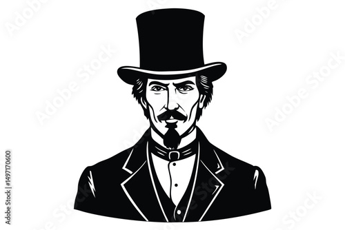 Retro, handsome gangster in a black suit and hat, looking elegant and smiling with a confident style