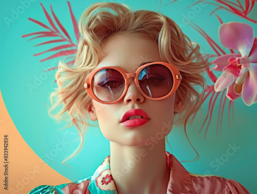 Retro style pastel colors summer background. Fashion woman wearing big sunglasses.