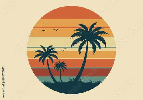Retro Sunset Palm Trees Vintage Tropical Island Paradise Illustration - EPS Vector Graphic