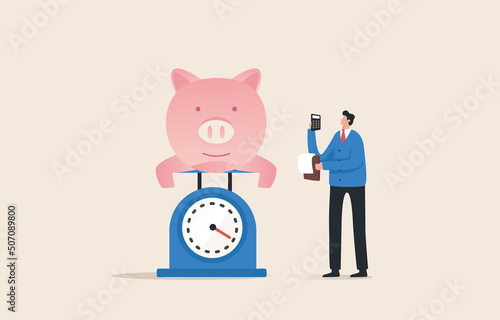 Return on deposit. Make a financial plan, check personal financial liquidity. Manage your savings. Piggy bank on scales and analyze.