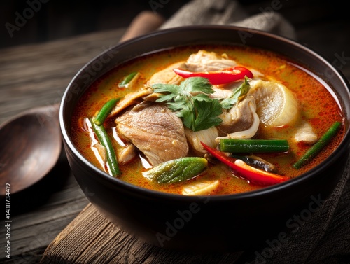 Rich and Flavorful Thai Tom Yum Soup with Meat and Vegetables