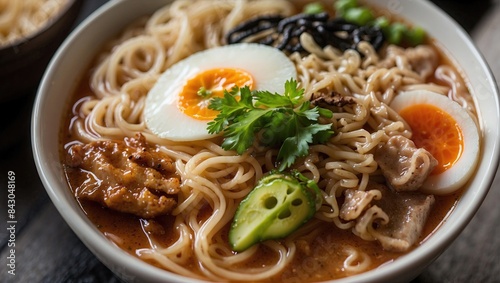Rich and savory ramen bowl featuring tender pork slices, soft-boiled egg, fresh cilantro, and sliced vegetables in a flavorful broth, creating a satisfying, hearty meal.