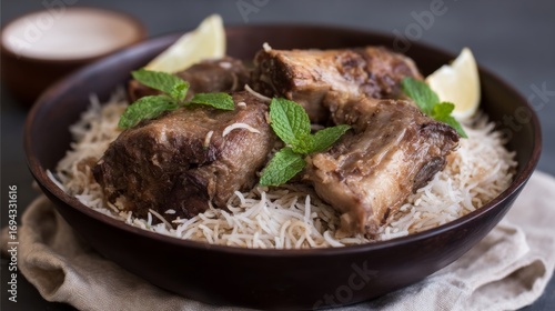 Rich aromatic biryani crowned with tender lamb pieces, evoking Eid celebrations, soothing saffron dreams, culinary voyage to South Asia