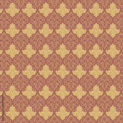 Rich gold and burgundy damask pattern with ornate baroque details. Seamless luxurious wallpaper texture perfect for classic and royal-themed designs.