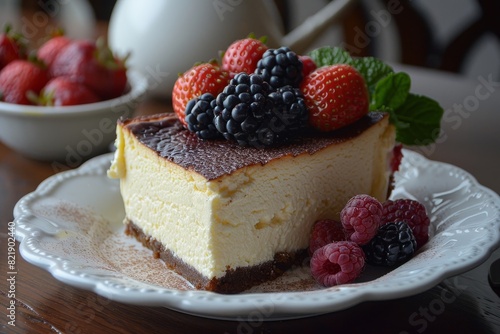 Ricotta Cheesecake: A slice of light and creamy ricotta cheesecake, possibly garnished with fresh berries.