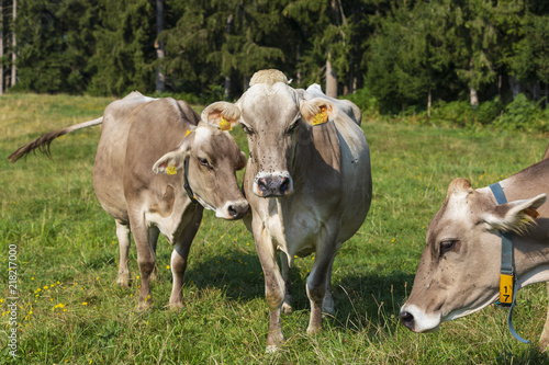 Rindviecher grasen in einer Koppel auf einer Almwiese im Allgäu.