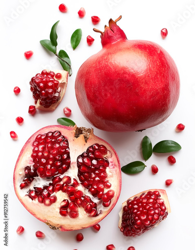 Ripe and fresh Whole and sliced Pomegranate isolated on white background
