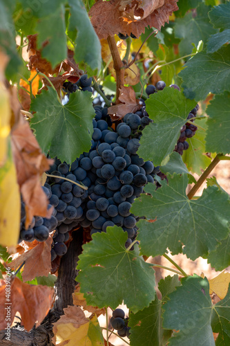 Ripe black or blue wine grapes using for making rose or red wine ready to harvest on vineyards in Cotes de Provence, region Provence, south of France