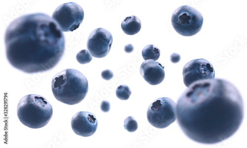 Ripe blueberries levitate on a white background