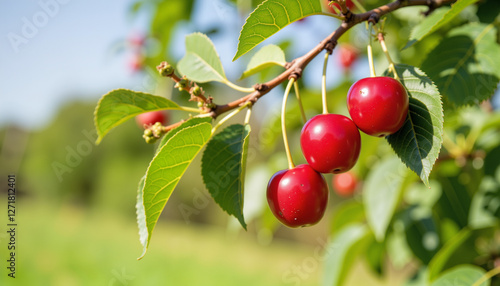 Ripe cherries hanging on tree branch, seasonal harvest celebration