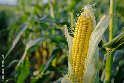 Ripe corn on the cob in the field, close-up