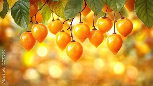 Ripe orange fruits hanging from a branch with green leaves against a blurred golden background.