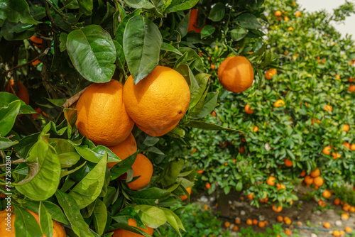 Ripe orange fruits on orange tree between lush foliage. View from below.