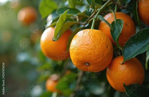 Ripe oranges hang on citrus tree branch. Sunny day in Mediterranean orchard. Fresh citrus fruit ready for harvest. Agricultural scene. Healthy produce from farm. Abundant crop. Organic agriculture