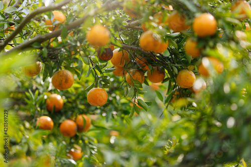Ripe oranges hanging on branch at tangerine garden