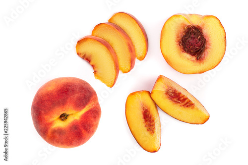 ripe peaches isolated on white background. Top view. Flat lay pattern