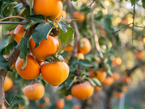 Ripe persimmons clustered on a branch, ready for harvest.