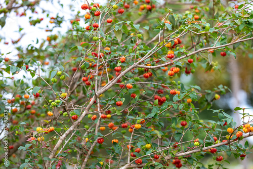Ripe pitanga fruits (Eugenia uniflora),on the tree and blurred background
