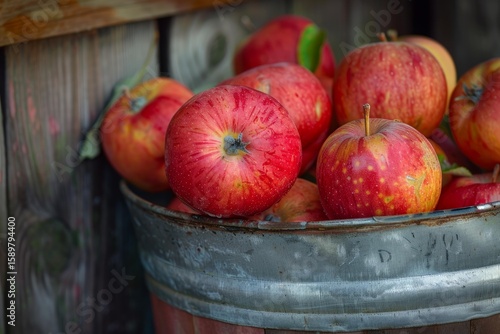 Ripe red apples spilling out of an old metal bucket, celebrating the autumn harvest and the abundance of nature's bounty