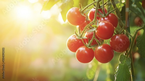 Ripe red cherry tomatoes on the vine, backlit by warm sunlight.
