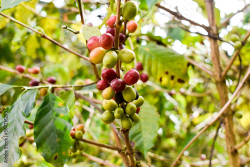 Ripe red coffee fruits on the tree. Close-up coffee beans on tree branch.