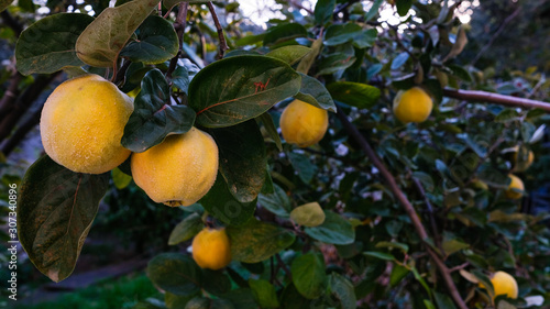 Ripe yellow quince fruits grow on quince tree with green foliage in autumn garden. Many ripe quinces, close up