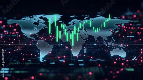 Rising green candlestick chart overlaid on a global map with financial centers highlighted in white, glowing network lines connecting continents,